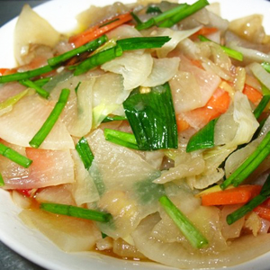 2、炒锅置火上,放油烧热,放入花椒炸黑捞出弃去,加入白萝卜条煸炒,加入鸡汤少量,翻炒至七成熟,加入茼蒿段煸炒,加精盐、味精调味。