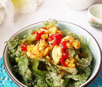 主料:茼蒿(适量)、蒜瓣(适量)、面粉(适量)、玉米面(适量)、盐(适量)、香油(适量)
