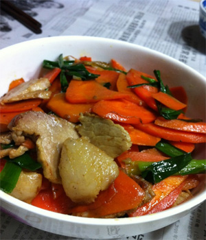 小贴士:胡萝卜炒肉片这道菜在炒的时候,油不要放太少哦,油太少就不好吃了。最好是猪油与大豆油混合一起炒,味道非常妙。