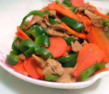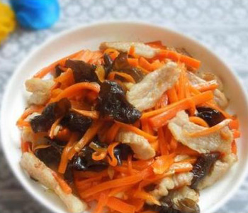 主料:胡萝卜300g、柿子椒50g、红椒50g、黑木耳50g、猪肉200g