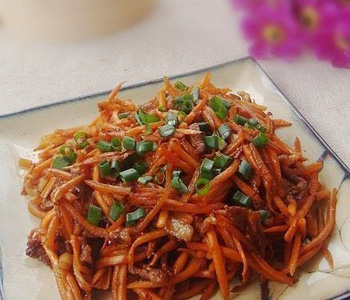 3)再加入胡萝卜丝快速翻炒,至胡萝卜变熟后,加少许食盐调味即可出锅。