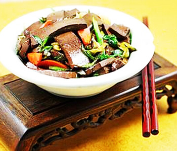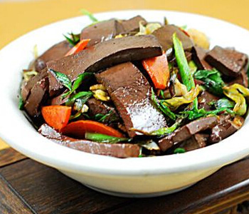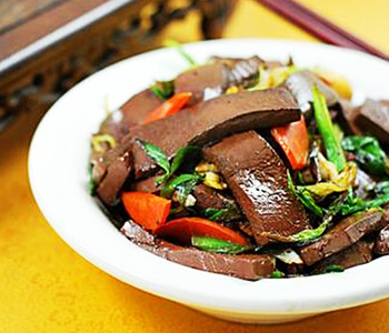 6、青蒜胡萝卜鸭血中的鸭血中含有丰富的蛋白质及多种人体不能合成的氨基酸,所含的红细胞素含量也较高,还含有微量元素铁等矿物质和多种维生素,这些都是人体造血过程中不可缺少的物质。