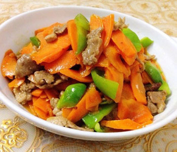 (4)然后倒入溜好的肉片青椒,继续在翻炒,直至胡萝卜完全变软后就可以关火装盘了。