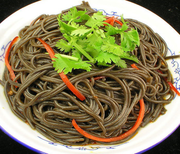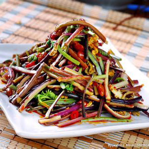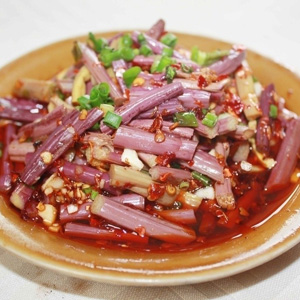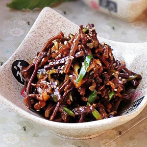 这道凉拌蕨菜粉中也放入了辣椒来调味,色泽红亮,在视觉上就使人很享受。辣椒具有的芳香气味,具有很好的开胃效果,所以这道菜是一道非常下饭的佳肴。