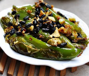 (2)锅内留底油烧热,倒入煸好的青椒,加入豆豉、盐、白糖、姜末稍炒,淋上醋即可