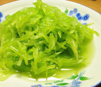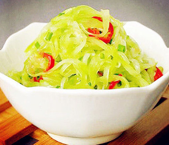 凉拌莴笋就是将莴笋切丝,加入各种佐料调制而成的一道美食凉菜,它的主料莴笋的营养价值颇高。莴笋是一种低热量、高营养价值的蔬菜,富含惊人的抗氧化剂、免疫细胞激活剂以及正常细胞的生长调节剂等微量物质,莴笋所含的蛋白质、碳水化合物、多种维生素和微量元素的质量均优于普通蔬菜,而热量和碳水化合物的含量都低。