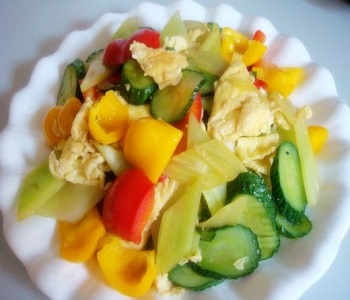 材料:莴笋、黄瓜、黄椒、红椒、鸡蛋、葱、姜、蒜、花生油、盐、