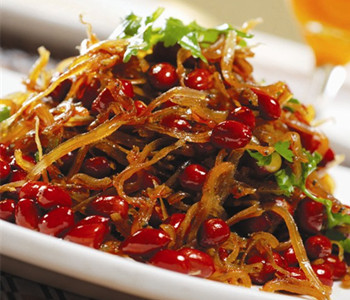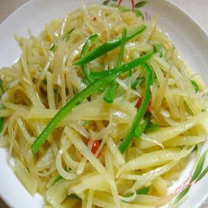 2、炒锅注油烧热,下入土豆丝炸至金黄色,捞出控油备用