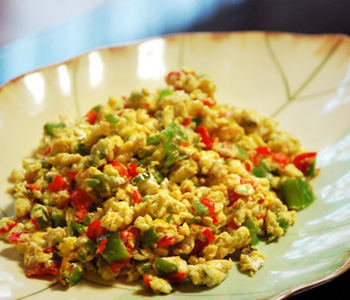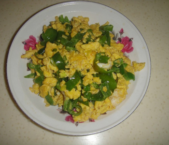 3)青红椒翻炒出香味后下打好的蛋液,蛋液凝固后用铲子炒碎即可出锅。