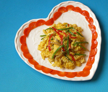 材料:青红椒各半个、鸡蛋三个、葱10克、盐少少许、油一汤匙