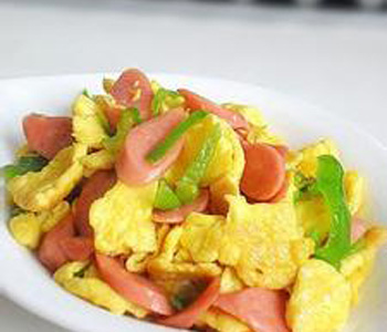 3)再起锅热油,把青椒放到锅里煸炒一下,加入炒好的鸡蛋继续翻炒一下,最后把火腿丁放到锅里一起翻炒,加盐,味精调味即可。