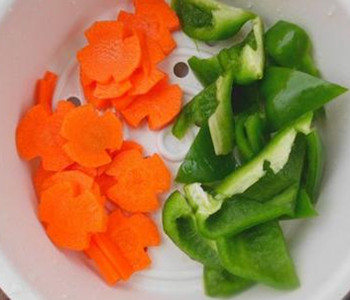1、胡萝卜去皮洗净,切菱形片。青椒洗净,切小片。葱姜蒜切碎。