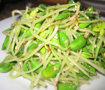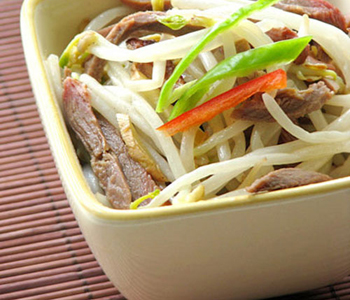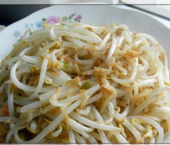 原料:绿豆芽250克,瘦肉100克,豆油40克,料酒、白糖、精盐各适量。