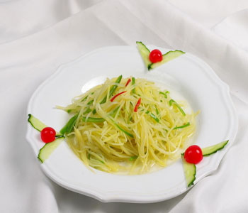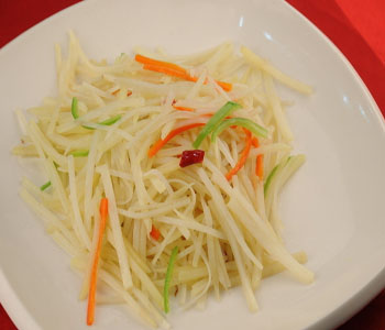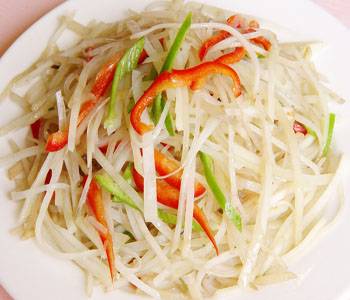 土豆丝想要吃脆口的就一定要泡水,这样能减少淀粉,而且色泽也会更好。