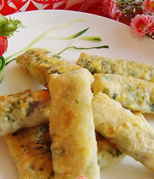 6、 锅置火上油烧至7成热,转中火将包好的春卷逐一放入。