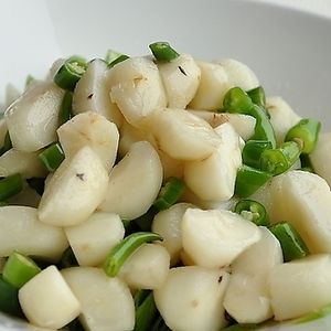 选用新鲜的荸荠,挑出烂果、裂果。将荸荠用清水冲洗干净后,去掉外皮和边芽。