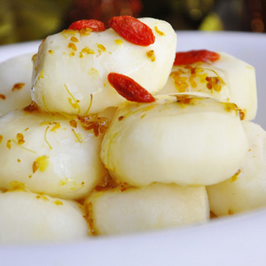 把煮熟的马蹄糊倒入一深碟中,冷却后切成小块即可食用。清甜的马蹄糕,散发出淡淡的菊花香味。