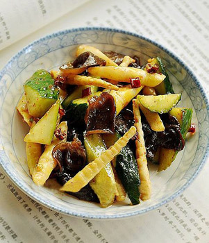 6 将竹笋、黄瓜、黑木耳放入大一点的容器内,浇入步骤7中炸好的油,加适量盐、适量醋、1小勺白糖、1小勺芝麻香油,拌匀即可。