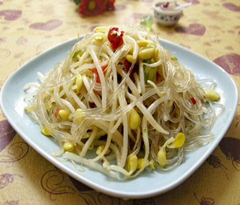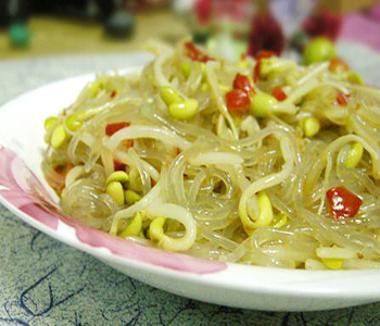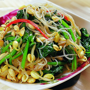 绿豆芽中含有丰富的蛋白质和多种氨基酸,粉丝则富有很高的热量。所以这道菜也很适合青少年食用,可在其生长发育、新陈代谢方面发挥良好的作用。