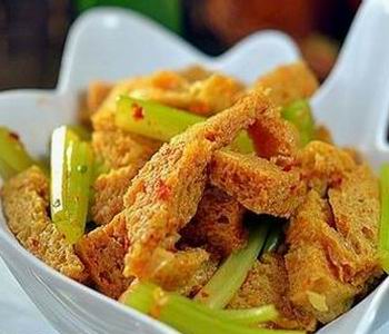 6、最后大火放入小芹菜段一起翻炒,加盐,少许酱油,炒均匀后装盘就可上桌了。