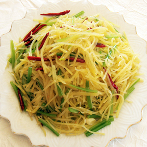 1、将土豆去皮洗净,切丝,随后将土豆丝放在加醋的冷水中浸泡;
