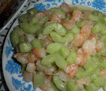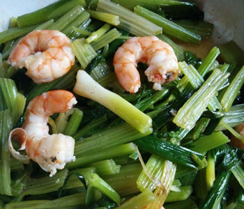 材料∶芹菜、鲜虾、鸡蛋、红辣椒、油、盐、酱油、料酒、蒜、生姜。
