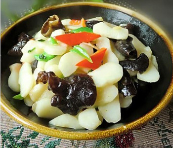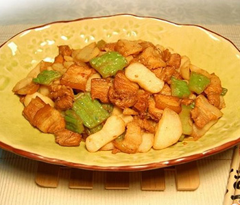 2、炒锅烧热放入熟花生油,烧至七成热,即将冬菇、荸荠片同时下锅煸炒,放入酱油,姜末,精盐,白糖,味精,料酒,鲜汤150克,烧开用湿淀 粉勾芡,淋熟油起锅装盘即成。