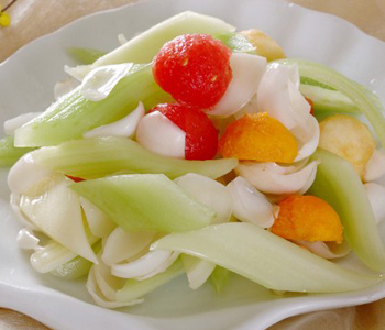 材料:西芹,鲜百合,虾仁,红辣椒,鸡蛋清,姜片,盐,水淀粉,白糖