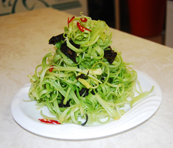 2、芹菜入开水中烫一下,再用凉水冲凉,切丝,装盘;