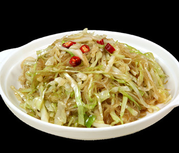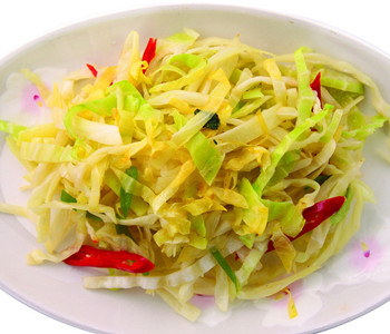 3、倒入卷心菜丝,煸透后调味,炒熟即可食用。