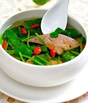 4、锅内放入猪油,姜片,炒出香味后加入水。水烧开后放入菠菜,加入盐,猪肝,拌匀煮1分钟即可。