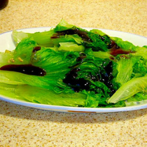 3、锅中再放油烧热,依次放入蚝油、绍酒稍炒至熟,出香味,把汁浇在生菜上,拌匀即成。