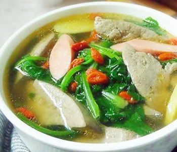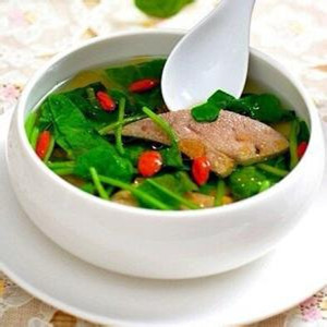 秋冬季节,天气很明显变得干燥,这时候最适合用猪肝和菠菜滚汤,汤清澈鲜甜之余,还有以形补形之效。猪肝和菠菜富含维生素A、B2、铁和钾,两者一荤一素煮汤饮用,除了有补肝、明目和补血的作用,还是治疗贫血、口角炎和夜盲症的佳品。下面我们就来了解猪肝菠菜汤的功效。