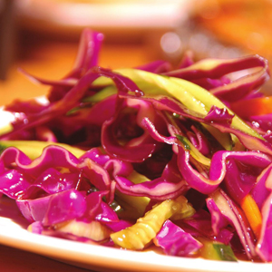 紫甘蓝营养丰富,据测定,每100克鲜菜含胡萝卜素0.11毫克、维生素B10.04毫克、维少素B20.04毫克、维生素C39毫克、尼克酸0.3毫克、糖类4%、蛋白质1.3%、脂肪0.3%、粗纤维0.9%、钙100毫克、磷56毫克、铁1.9毫克。作为一种常见的凉拌菜,紫甘蓝具有其独特的功效:
