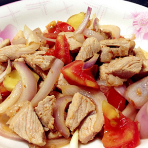 原料:洋葱一个,里脊肉250克,剁辣椒一大勺,生抽一大勺,料酒一小勺,淀粉少许,盐一小勺。