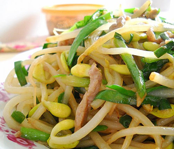 2、猪肉切丝,用淀粉、生抽拌匀;韭菜洗净、切段;黄豆芽洗净备用。