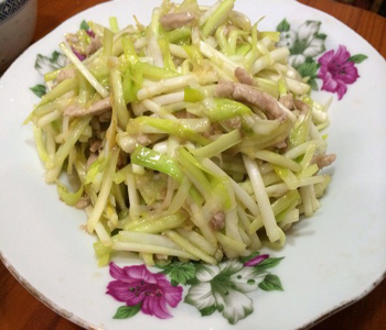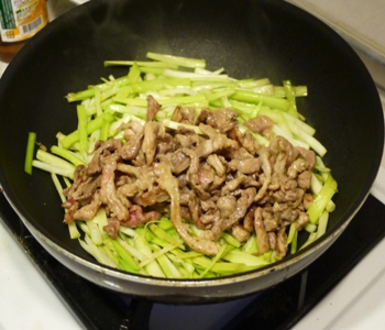 5、炒锅烧热后放油,油温后下肉丝大火煸炒,至变色后盛出。