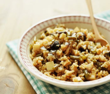 (5)炒匀之后一起移入电饭煲,加水,按下煮饭档就可以了。(水量和平时烧饭一样即可,加完水可以尝下水的咸淡)。