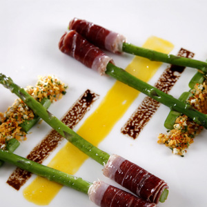 首先选粗大的芦笋去皮泡水,裹蛋黄糊稍炸一下,然后用葱姜爆香锅底加入高汤、盐等调料,大火烧开后下入芦笋改小火塌制1—2分钟即可出锅。