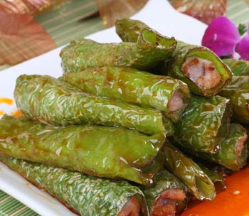 1、把尖椒的尾巴去掉,弄成尖椒成筒状,接着把拌好的肉馅塞进尖椒里;