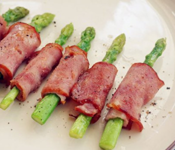 6、然后一根芦笋锅一块培根卷起来,牙签插进去,请不要横着插,记得要斜着插这样固定的面积最大。