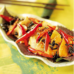 4、用较多的油烧热,迅速翻炒肉,同时加入炒好的尖椒,紫苏,葱和胡椒粉,炒匀后起锅。
