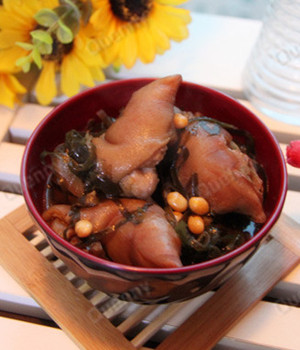 用料:黄豆、姜、花椒、老抽、料酒、水、八角、食盐、猪蹄、海带(干)
