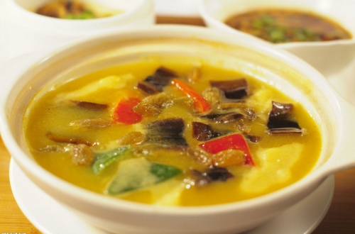 先把黄鳝剥皮开膛洗净,用热水去掉黄鳝外皮黏液,准备好各样佐料,油烧热后,先把小葱、姜片下锅试油,放入微量盐、食用糖,接着黄鳝入锅,加入肉桂、八角等等干料,翻炒约5分钟,注入开水适量,放入花椒(用纱布扎袋)、枸杞、条参、当归等药物,大火炖10分钟,加入葱段、蒜块、干辣椒、金针、拳菜、豆筋等等配菜,小火煲30分钟,加入盐调整咸淡,滴少许白酒去除腥膻,放入切好的青椒丝,加入小磨油,装盘出锅。