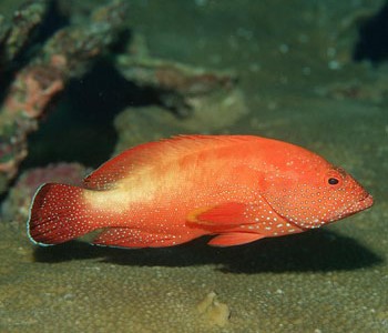 (2)赤点石斑鱼背鳍Ⅺ,16条,背鳍基底具一黑斑,体棕褐色,头、体、奇鳍有许多橙黄色斑(浸制标本变白色)。暖温性中、下层鱼类。成鱼摄食鱼、虾、蟹。雌雄同体,雌性先成熟,大部分3龄性成熟,体长231-295毫米时,从雌性转变为雄性。大部分6龄鱼(个别为5龄鱼)体长340-400毫米,绝对生殖力为10万—25万粒,产卵期为5-9月,盛期为5-6月。肉鲜美,可供出口,是名贵鱼类,现已进行人工繁殖,是网箱及浅海养殖对象。分布于我国台湾,东海、南海,以及印度和日本。