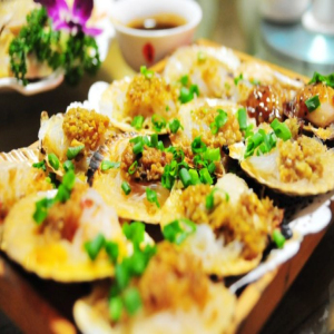 扇贝它有食疗功效, 一般人群均可食用(患有痛风的人禁食) 适宜高胆固醇、高血脂体质的人以及患有甲状腺肿大、支气管炎、胃病等疾病的人;另外 许多贝类是发物,有宿疾者应慎食;贝类性多寒凉,故脾胃虚寒者不宜多吃。有时候,简单的制作也同样是那么美味,没有过多的调味料,反而保持了更多的原味,保持扇贝的营养,扇贝因预热后收缩,所释放出来的汤汁更能让你感受到海鲜的“鲜”味,上面加入大蒜末,抑制住扇贝本身过分的腥味,做到了鲜而不腥。吃的时候先吸上面的汤汁,甘甜的汤汁,瞬间在你的舌尖弥漫,吸入汤汁后,你能清晰地感觉到那股甘甜在嘴里回荡着。如此美味如此营养价值高的海鲜料理,大家快去尝试制作吧。
