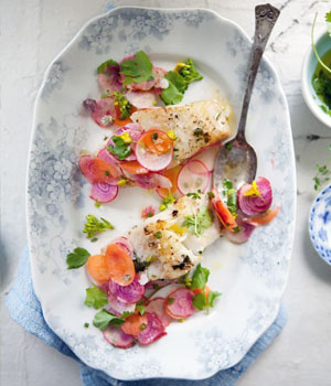 7、鳕鱼摆在餐盘里,洋葱、胡萝卜片随意撒在上面,最后撒上一些油麦菜花。