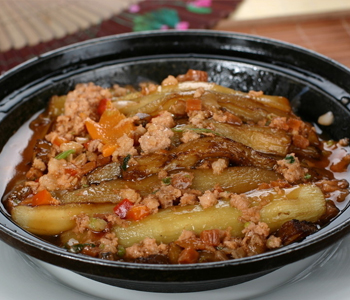 放入鳕鱼和茄子,翻炒均匀,炒6分钟左右,淋上烧烤汁,大火收汁就OK了。