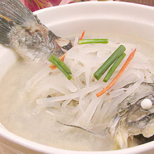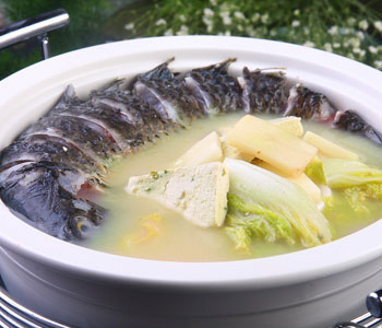 4、入锅清炖至熟,淋上猪油少许即成。用荷包鲤鱼炖制而成。成菜肉质细嫩,汤清而粘唇,味醇鲜美。