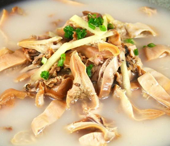材料:鲜河蚌1500克,干墨鱼250克,猪五花肉50克,饭豆50克。调料:盐10克,味精3克,胡椒粉8克,料酒10克,姜丝、葱花各10克。